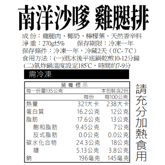 成 分:雞腿肉、椰奶、黃咖哩、檸檬葉、椰糖、天然香辛料